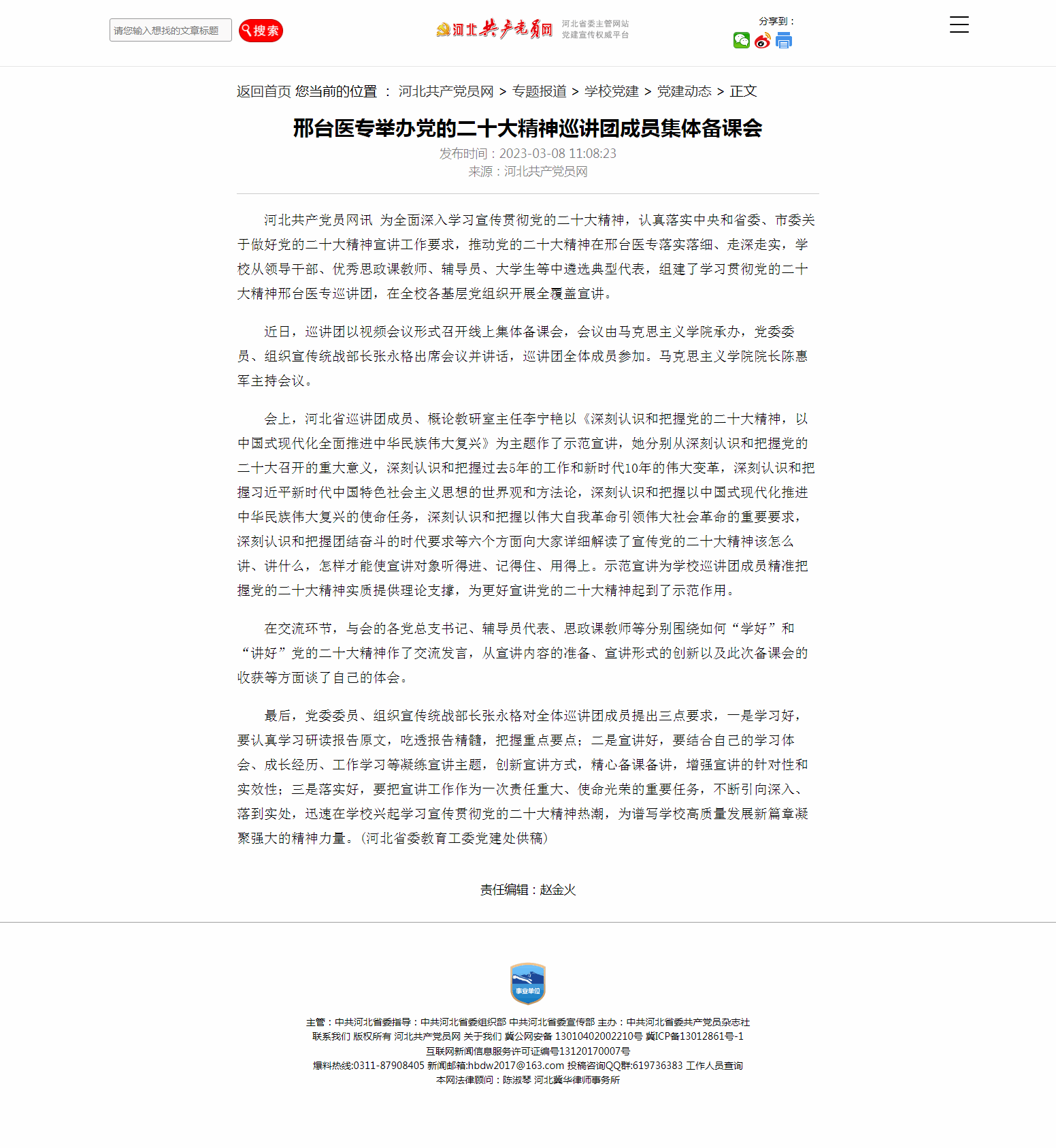 下一条:河北教育网报道:邢台医专组织开展“学习雷锋精神、争做时代先锋”主题党日活动