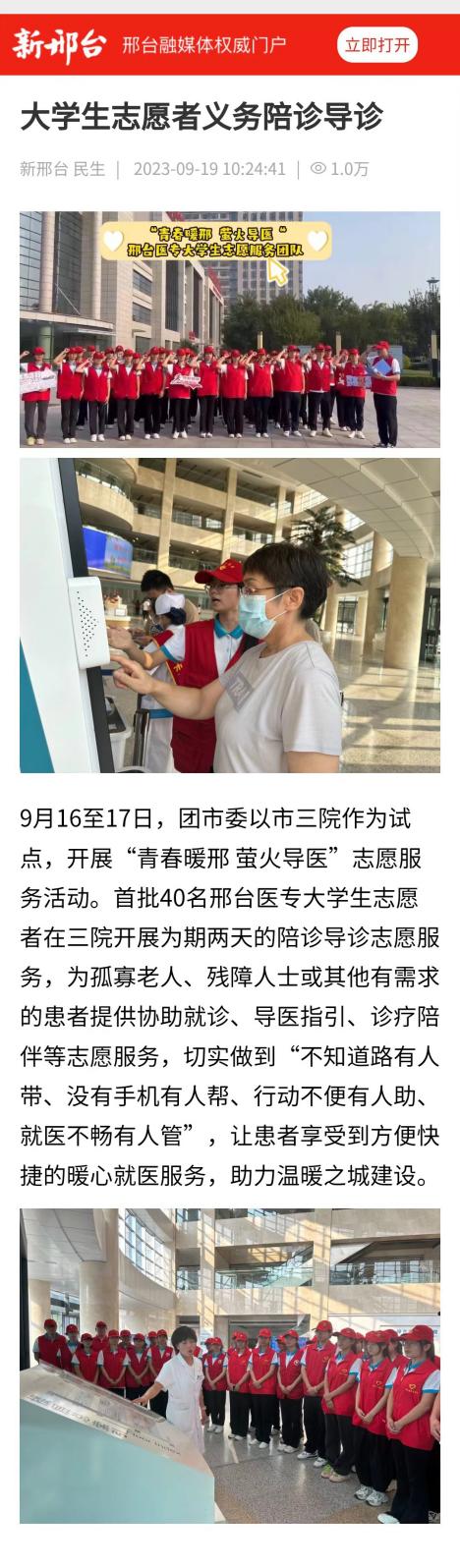 9月19日,“新邢台”媒体平台以“大学生志愿者义务陪诊导诊”为题对beat365“青春暖邢 萤火导医”志愿服务活动进行了报道。