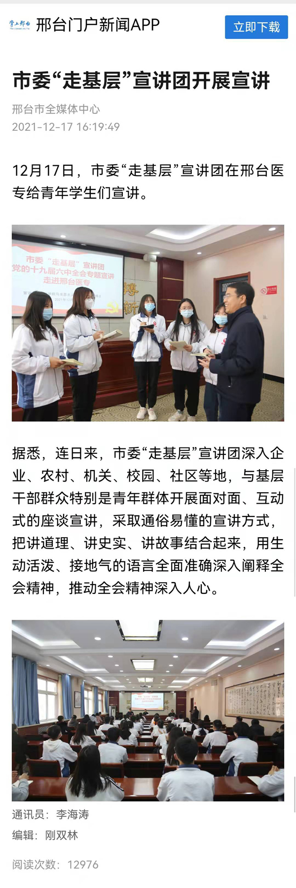 上一条:掌上邢台报道“市委宣讲团走进邢台医专宣讲党的十九届六中全会精神”
