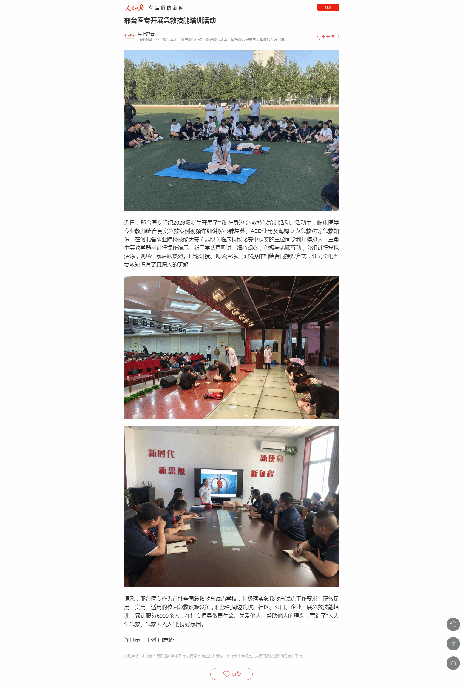 人民日报客户端报道:邢台医专开展急救技能培训活动