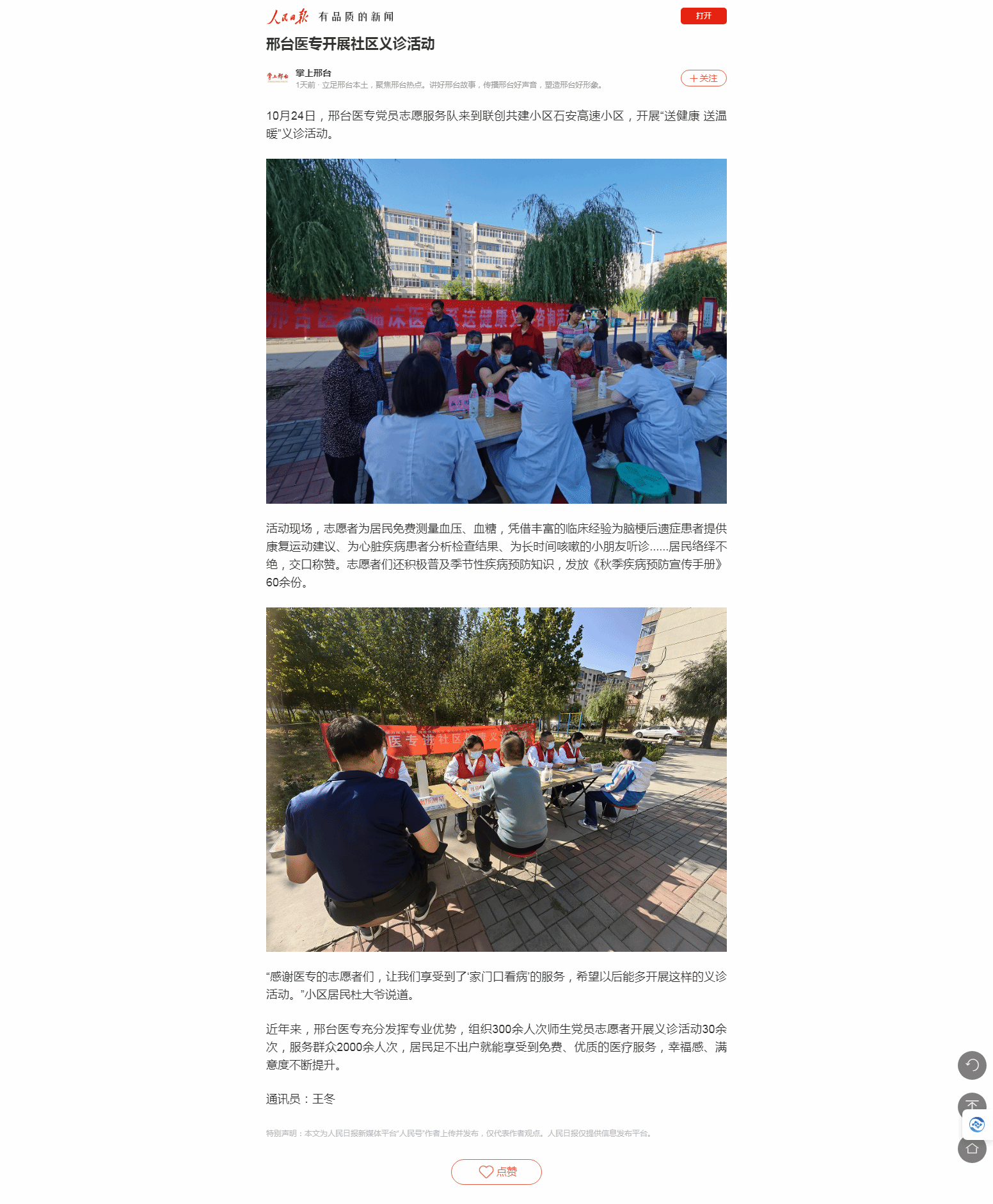10月24日,邢台医专党员志愿服务队来到联创共建小区石安高速小区,开展“送健康 送温暖”义诊活动。