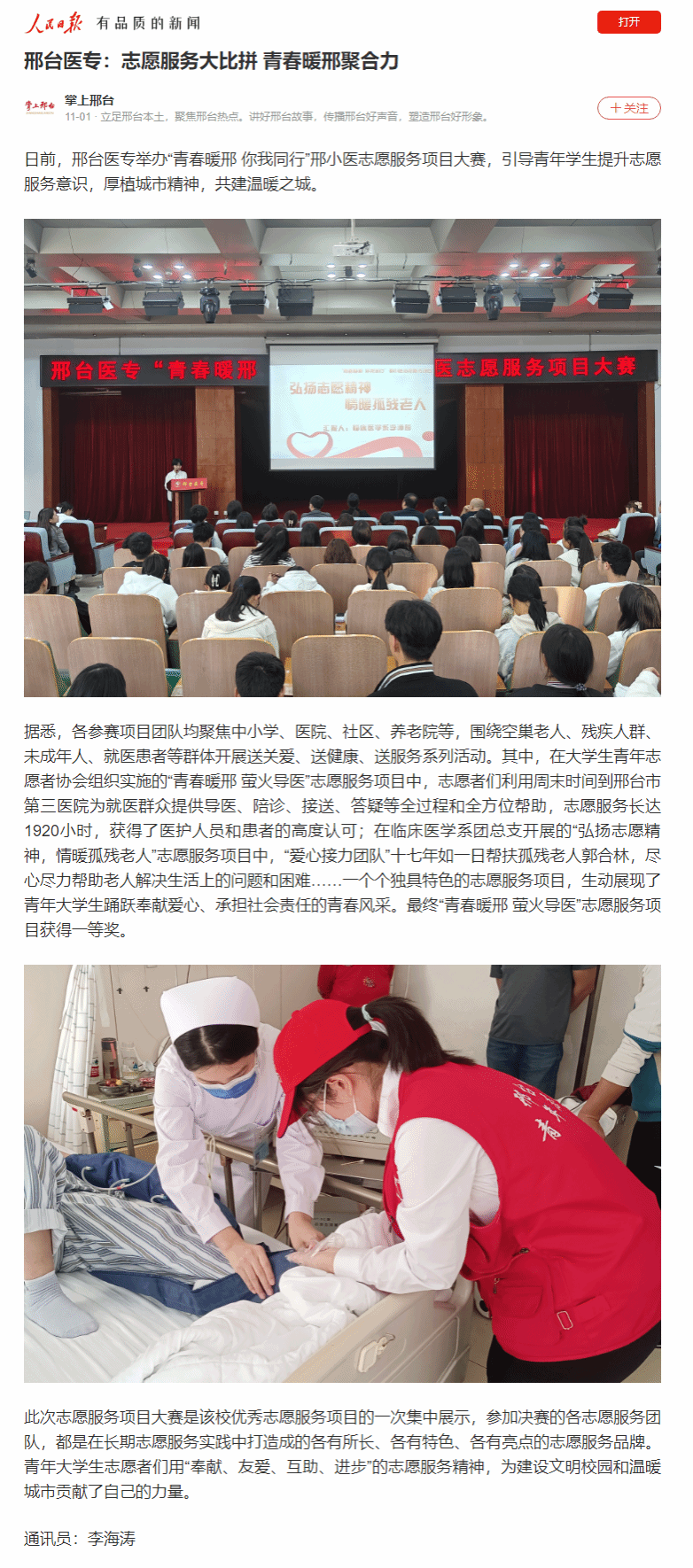 日前,邢台医专举办“青春暖邢 你我同行”邢小医志愿服务项目大赛,引导青年学生提升志愿服务意识,厚植城市精神,共建温暖之城。