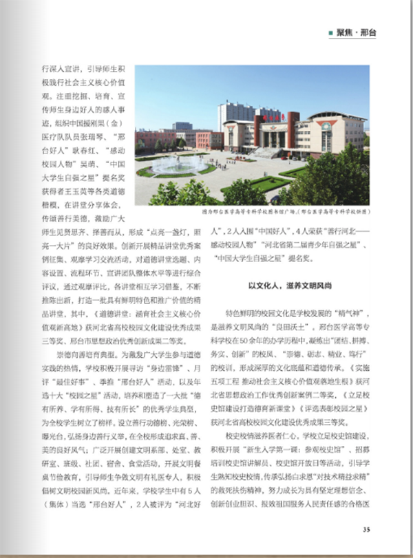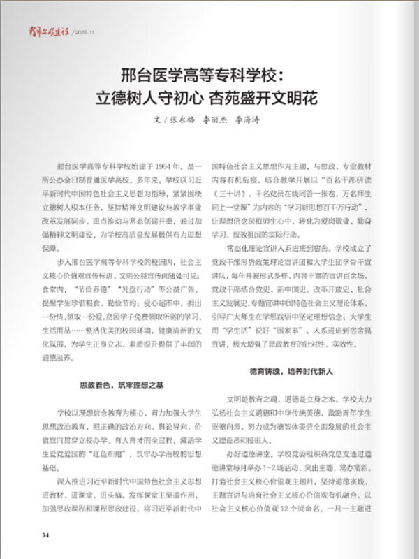 经邢台市文明办推荐,beat365精神文明工作《邢台医学高等专科学校:立德树人守初心 杏苑盛开文明花》在由河北省精神文明建设委员会办公室主办的《精神文明建设》2020年第11期刊登。