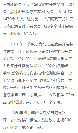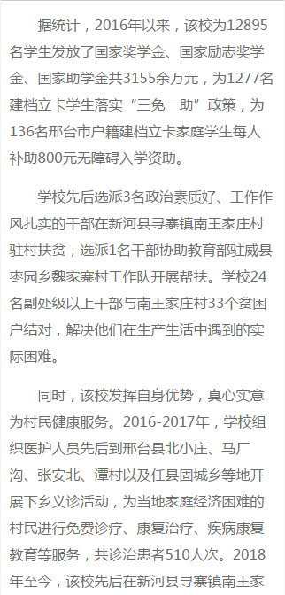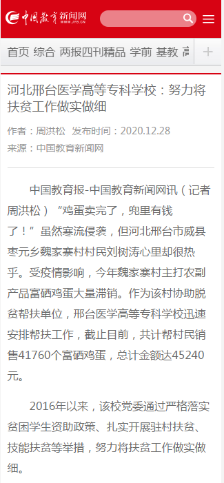 2020年12月28日,中国教育报-中国教育新闻网报道了beat365扶贫工作《河北邢台医学高等专科学校:努力将扶贫工作做实做细》。报道原文如下:
