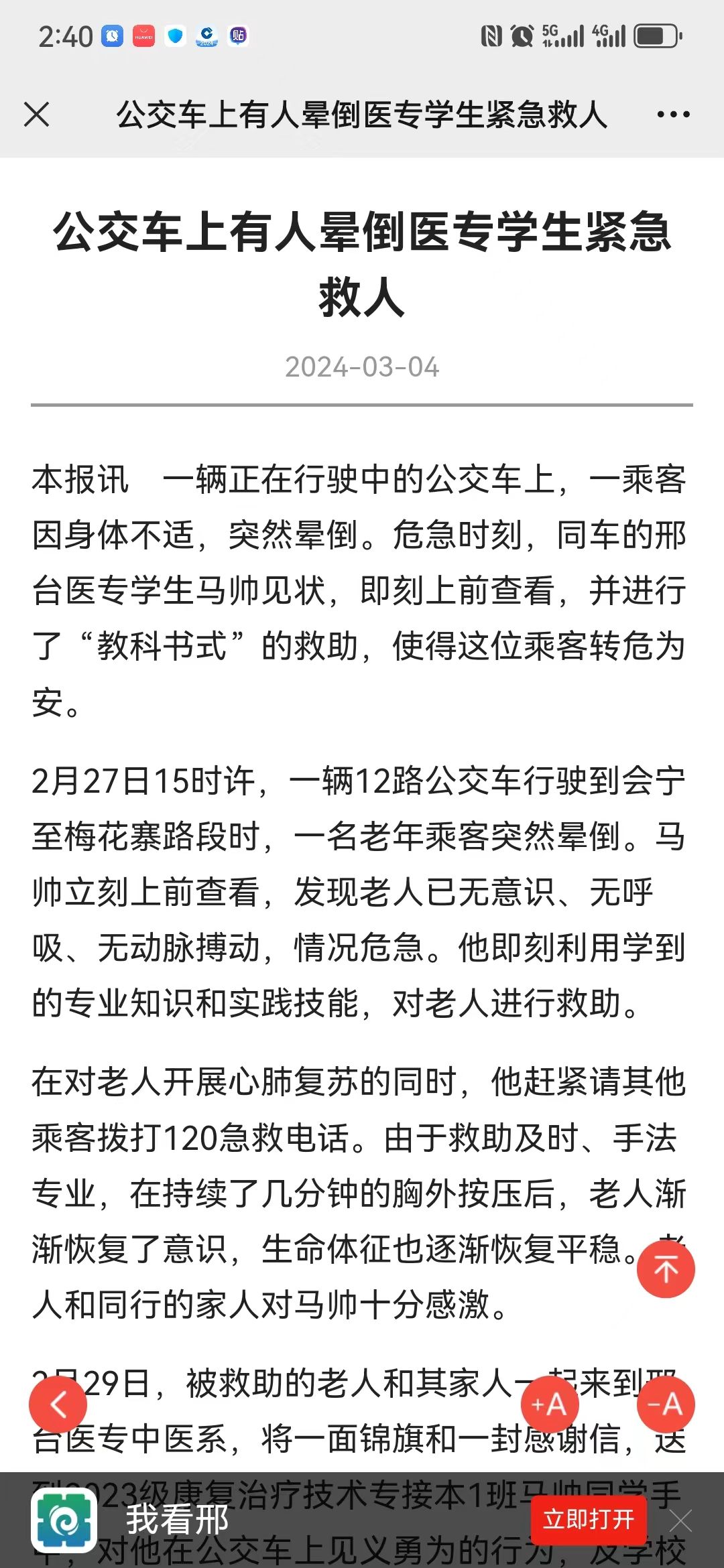 本报讯 一辆正在行驶中的公交车上,一乘客因身体不适,突然晕倒。危急时刻,同车的邢台医专学生马帅见状,即刻上前查看,并进行了“教科书式”的救助,使得这位乘客转危为安。