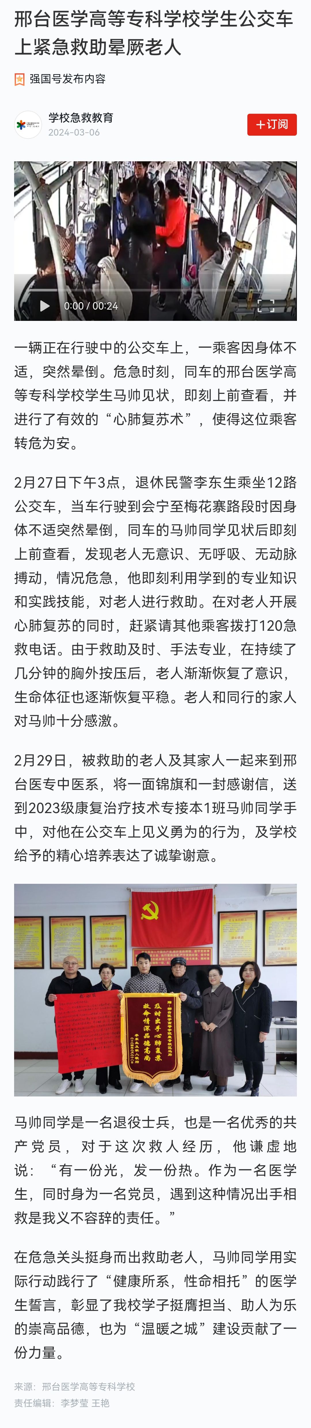 一辆正在行驶中的公交车上,一乘客因身体不适,突然晕倒。危急时刻,同车的邢台医学高等专科学校学生马帅见状,即刻上前查看,并进行了有效的“心肺复苏术”,使得这位乘客转危为安。