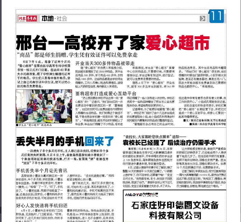 上一条:河北教育网、邢台文明网报道:邢台医专开展“人人学雷锋 城市更文明”志愿帮扶活动