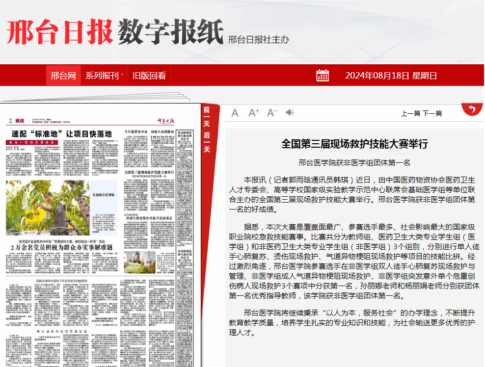 据悉,本次大赛是覆盖面最广、参赛选手最多、社会影响最大的国家级职业院校急救技能赛事。比赛共分为教师组、医药卫生大类专业学生组(医学组)和非医药卫生大类专业学生组(非医学组)3个组别,分别进行单人徒手心肺复苏、烫伤现场救护、气道异物梗阻现场救护等项目的技能比拼。经过激烈角逐,beat365平台官方网站参赛选手在非医学组双人徒手心肺复苏现场救护与管理、非医学组成人气道异物梗阻现场救护、非医学组突发意外单个危重创伤病人现场救护3个赛项中分获第一名,孙丽娜老师和杨丽娟老师分别获团体第一名优秀指导教师,该学院获非医学组团体第一名。