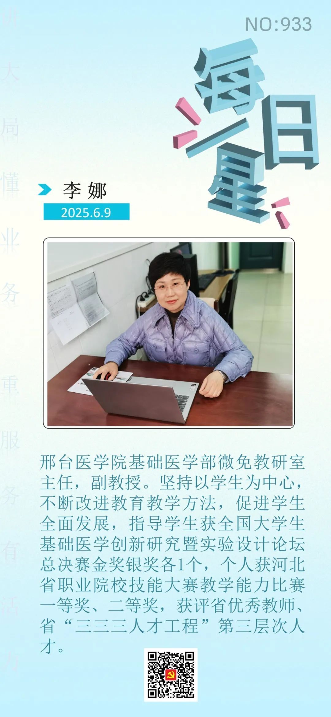 学校紧扣“讲大局、懂业务、重服务、有活力”总要求,坚持党建领航,聚焦重点任务,持续提高工作效率,转变工作作风,加强党员干部和教师队伍建设,涌现出一批叫得响、立得住、过得硬、师生认可的先进典型。经组织宣传统战部推荐,基础医学部微免教研室主任李娜被市直工委评为6月9日“每日一星”,事迹在“机关党建订阅号”【每日一星·四型干部】栏目报道。