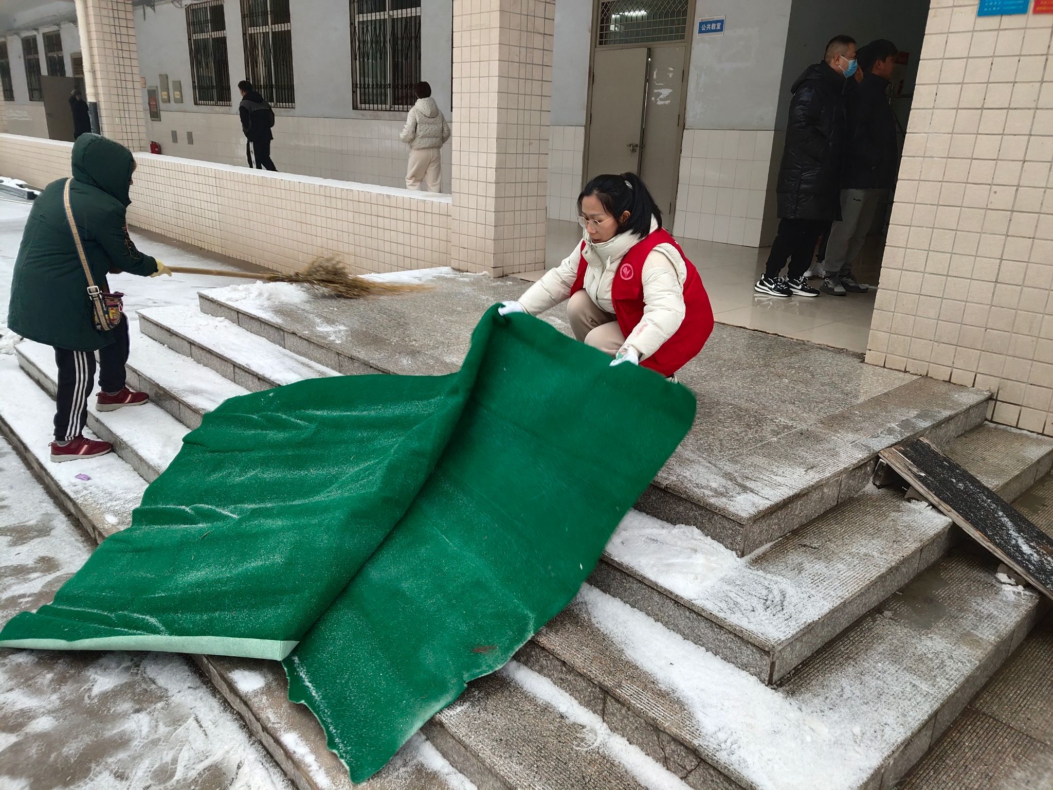 12月13日上午,新一轮降雪来袭,为了确保师生出行安全和教育教学工作的正常进行,学校组织宣传统战部协调后勤管理处及各系部20余名志愿者在教学楼、实训楼等地铺设了百余平米的防滑毯,消除了地面湿滑带来的安全隐患。志愿者们冒着风雪将防滑毯裁成合适的尺寸,逐一铺设到教学楼、实训楼入口台阶处,为师生们铺就了一条充满温暖的安全之路。